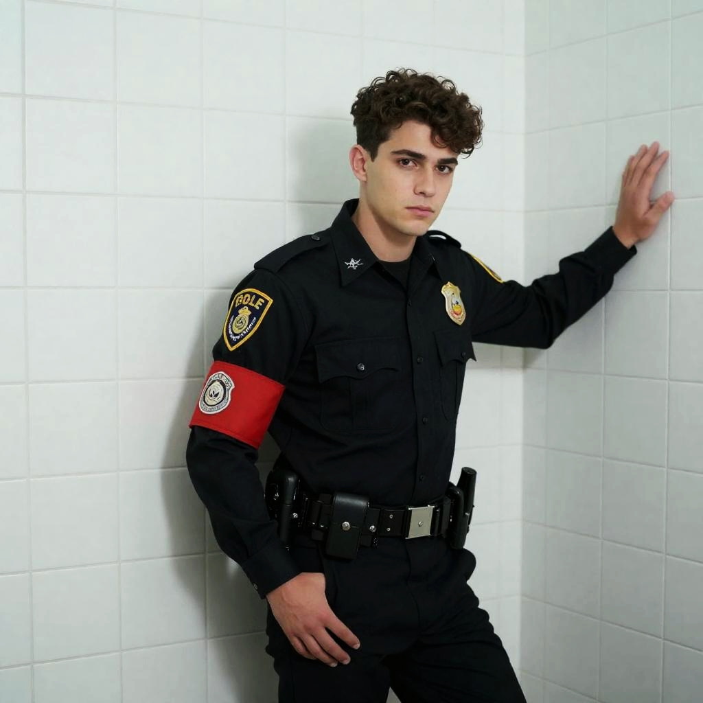 Photograph of a young man with curly brown hair, wearing a black police uniform with a badge and red armband, leaning against a white-tiled wall. He has a serious expression, right hand resting on his thigh, left hand on the wall. Light greenish hue.