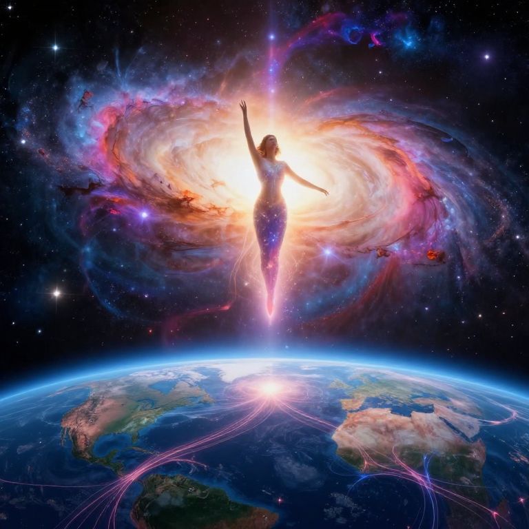 Digital artwork depicting a silhouetted figure with arms raised, standing at the center of a vibrant, swirling galaxy. The figure is illuminated by a bright, radiant light, creating a glowing aura. The galaxy features vivid colors of pink, purple, blue, and orange, with stars and cosmic dust scattered throughout. Below, Earth is visible, with detailed landmasses and oceans, surrounded by a thin blue atmosphere. Pink and blue energy lines extend from the figure to the planet, suggesting a connection or influence. The background is a deep, star-filled space, enhancing the cosmic theme.