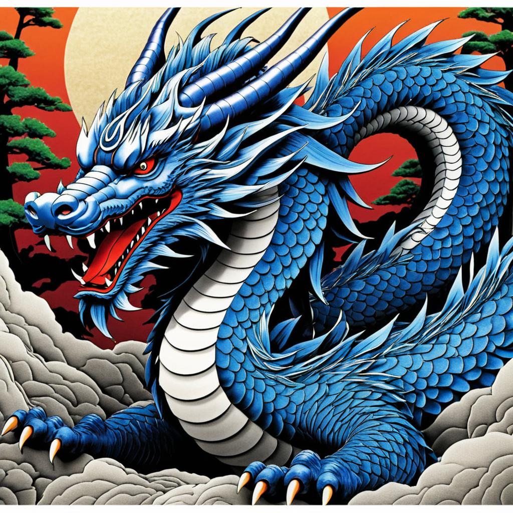 Manga-style digital artwork of an ancient blue dragon featuring detailed scales, sharp horns, and fierce orange eyes. The dragon is depicted amidst stylized waves and rocky shores, with traditional Asian pine trees and misty mountains in the background, inspired by Japanese art aesthetics.