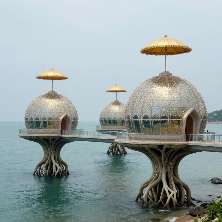 A serene coastal scene unfolds where colossal, otherworldly domes perch gracefully on organic, root-like supports, defying gravity as they float above a tranquil sea, each crowned with golden parasols and connected by a shimmering walkway.