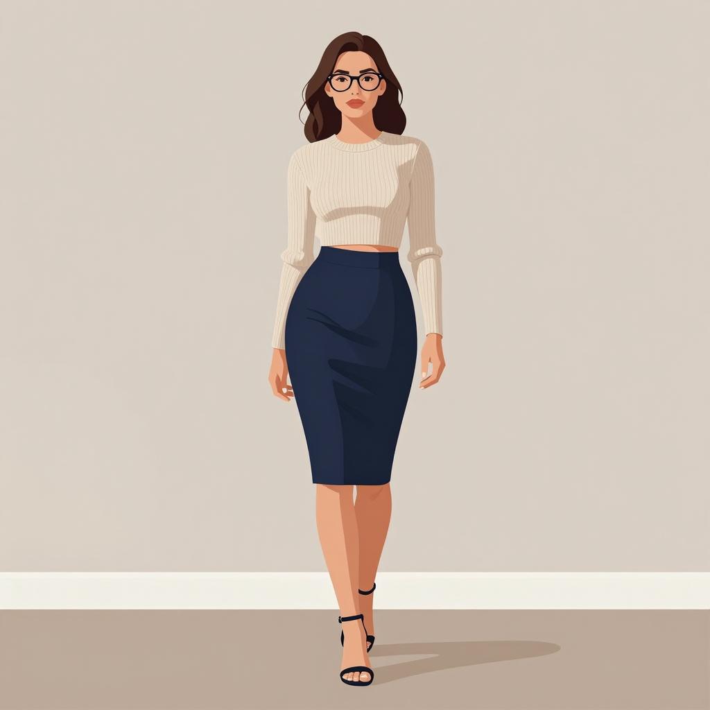A stylized illustration of a confident woman standing in a simple indoor setting, wearing a beige ribbed cropped sweater and a navy blue pencil skirt, accessorized with glasses and high-heeled sandals, clean lines and crisp shading highlighting modern fashion details, soft neutral beige and dark blue color palette