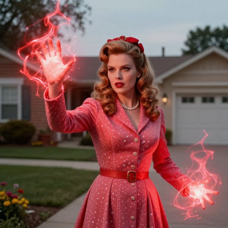 Wandavision-inspired image featuring a female sorceress in vintage 1960s attire casting spells with radiant red energy, surreal suburban background merging reality and illusion, vibrant colors, detailed textures, and an enchanting, mysterious vibe.