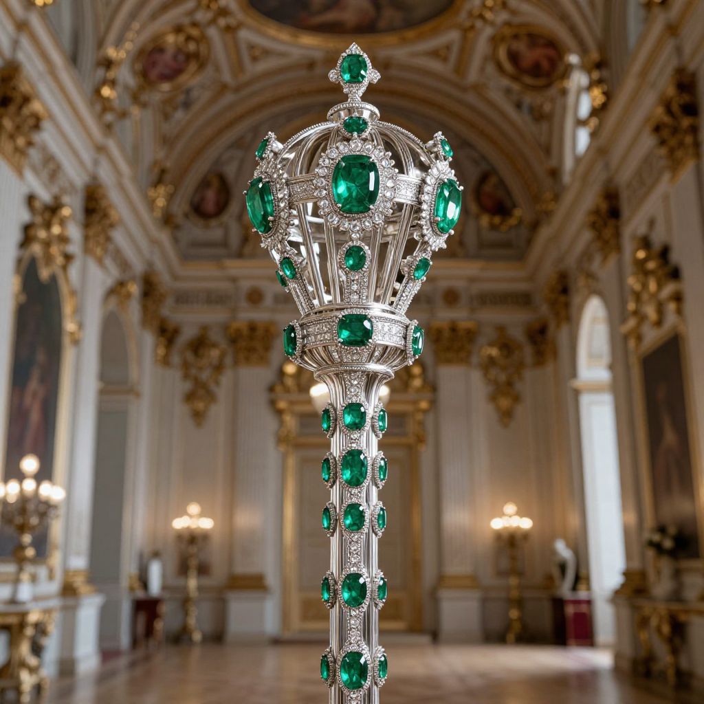 Elegant prongs of a royal silver scepter encrusted with emerald gems, shining brightly in a grand palace hall, baroque architecture in the background, rich colors and sophisticated detailing, regal and majestic mood.