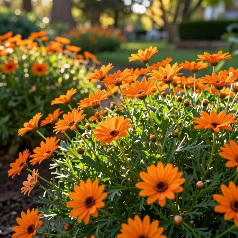 Sunlit garden bursts with vibrant orange daisies, their delicate petals radiating warmth as they sway gently in the breeze, surrounded by lush green foliage and bathed in golden sunlight filtering through distant trees.