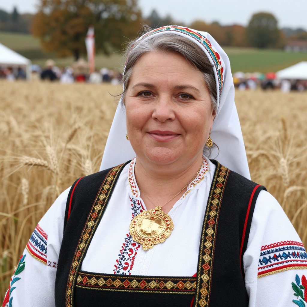 Photograph of a middle-aged woman with gray hair, wearing traditional white and black embroidered dress with gold pendant, standing in a golden wheat field. Sm
