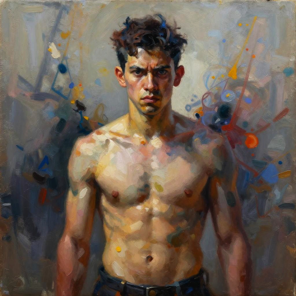 Realistic photo.Artistic, oil painting, avant-garde, young man, fierce determination, anomalous and dynamic colors, intensity realistic photo