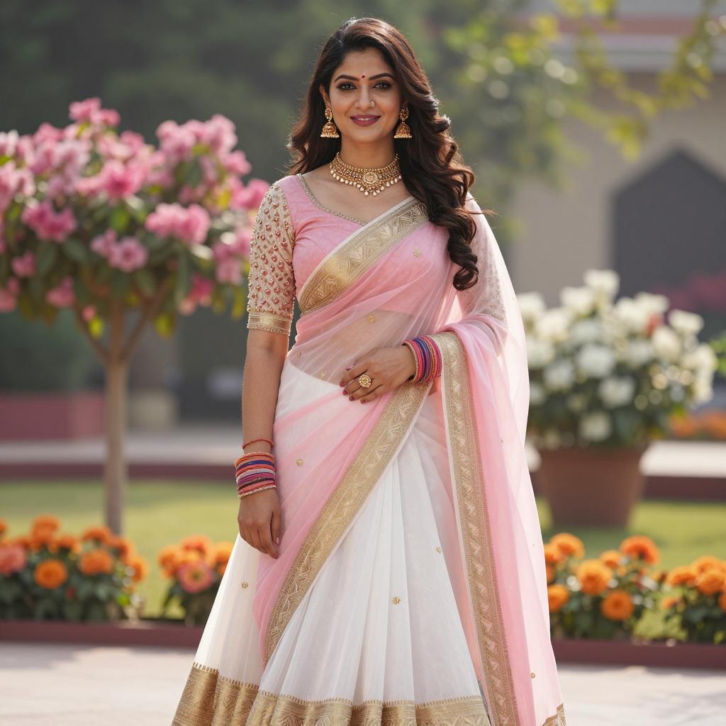 Dhoti salwar crop, photograph of a beautiful Indian woman standing in a flower garden, wearing a beige saree with pink accents, long brown hair, natural makeup, small gold earrings, sunny day, pink roses on both sides, palm trees in background, slightly blurred path, warm light, serene expression, traditional Indian attire, daytime setting, soft focus background