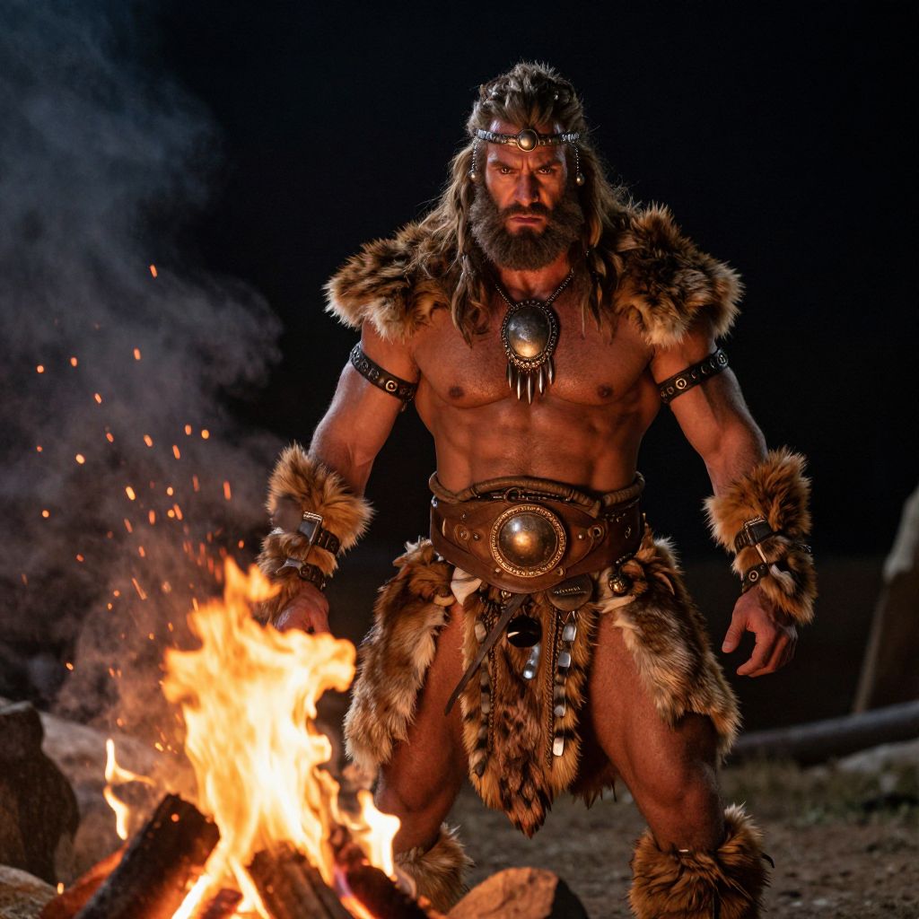Photograph of a muscular, bearded man standing in front of a roaring fire at night. He wears a metallic helmet adorned with spikes, a fur loincloth, and fur-trimmed arm and waist bands. His chest is bare, revealing a well-defined physique, and he has a large, circular, metallic pendant on a leather strap around his neck. His fur garments are brown and beige, and he has a dark leather belt with a large, round, metallic buckle. The background is dark, with the fire casting a warm glow and sparks flying upward. The scene has a primal, warrior-like feel.