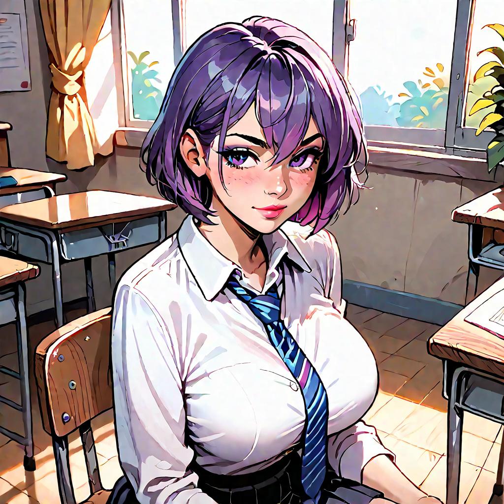 Fern is a girl with long purple hair and purple eyes, school uniform, classroom, score_9, _up score_8_up