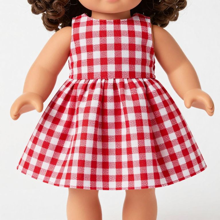 Sleek 18-inch doll showcasing a charming, hand-sewn skirt featuring a classic red-and-white gingham pattern, exemplifying the easy-to-follow sewing patterns by Oh Sew Kat! Boardwalk Boutique.