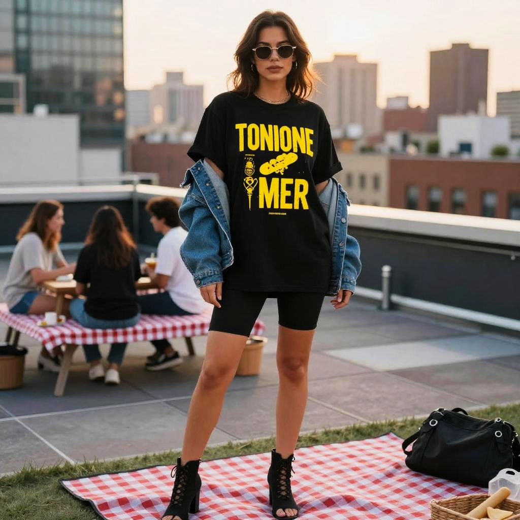 A woman, in an urban street style, wearing an oversized black graphic t-shirt with bold yellow print, a denim jacket draped over her shoulders, black biker shorts, and lace-up open-toe ankle boots, standing in a city rooftop picnic setting at sunrise, capturing the vibrant energy of the moment. Sexy. Pretty face and beutiful eyes