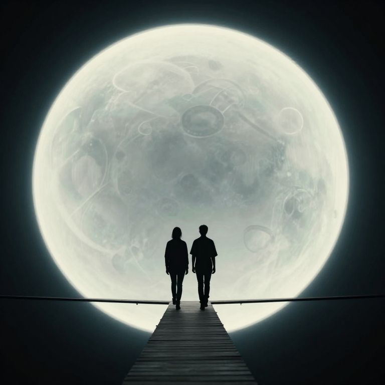 Silhouetted photograph of two people, one taller and one shorter, walking hand-in-hand on a narrow wooden bridge towards a massive, luminous full moon dominating the background. The moon's surface is detailed with craters and textures, creating a stark contrast with the dark, shadowy figures. The scene is set against a black, gradient sky, emphasizing the moon's bright, glowing light. The people's genders are indistinguishable due to the silhouettes, but they appear to be of average build. The overall mood is mystical and serene.