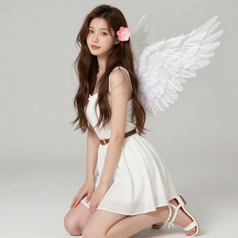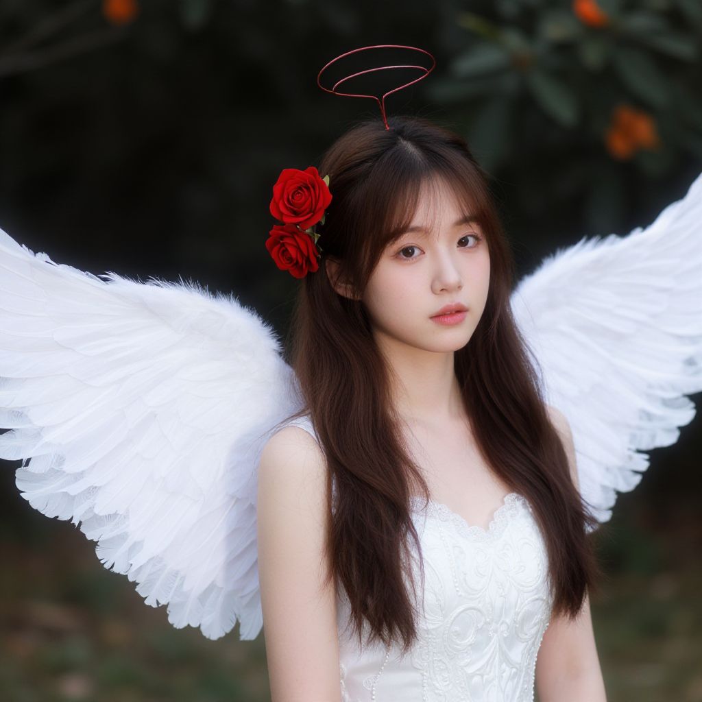 Photograph of an East Asian woman with long black hair, glowing white angel wings, and a halo, wearing a white satin dress, standing against a