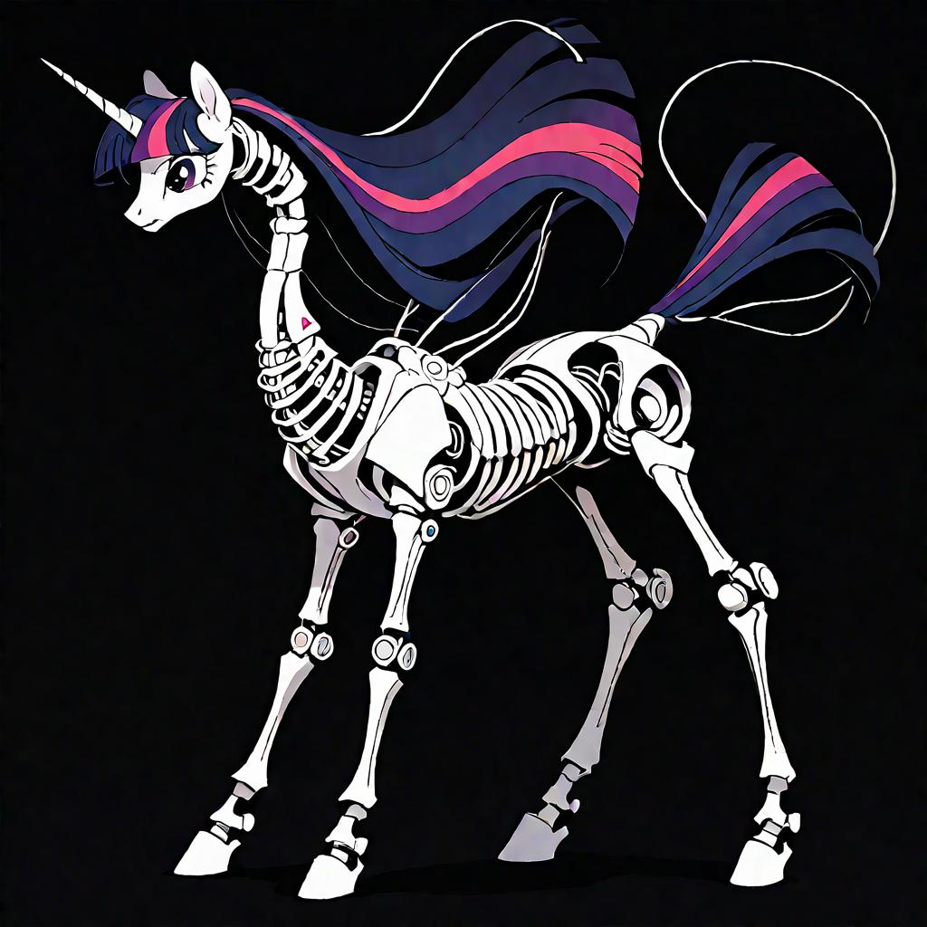 (score_9), black theme, all-black background, full body, character in the center of the screen, solo, (Twilight Sparkle style, tail, mane:1), slim waist, electrical wires hanging down, long neck, pony skeleton on a clean black background [skeleton on a black background: source_pony:0.9], exoskeleton without a body, anatomically correct, excellent body symmetry