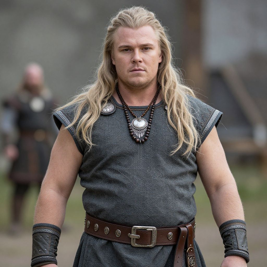 Photograph of a muscular, Caucasian man with long, blonde hair and blue eyes, wearing a sleeveless, dark gray, textured tunic with black, beaded necklaces and a circular brooch. He has a brown leather belt with a large, silver buckle and black wristbands. His stern expression is focused forward. The blurred background shows an outdoor medieval setting with a gray wall and another person in dark clothing. The lighting is natural, highlighting his strong features and the texture of his clothing.