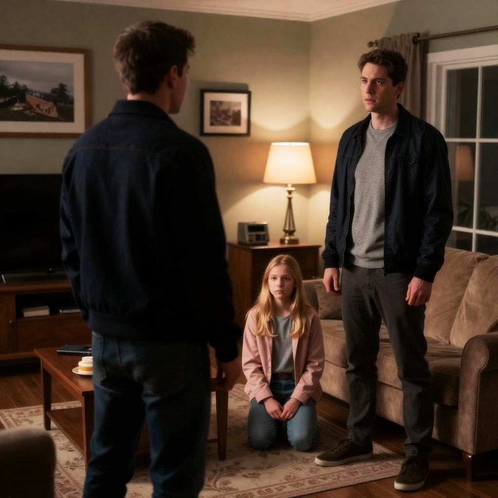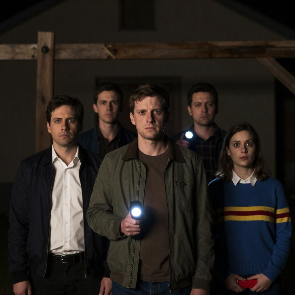 Photograph of a night scene in a cemetery. Man in plaid shirt kneels beside lying man, holding flashlight. Large dog stands next to them. Grave markers and trees in background. Man on ground has intense expression. Dog looks alert. Shadows and flashlight light create contrast. Three people, one dog.
