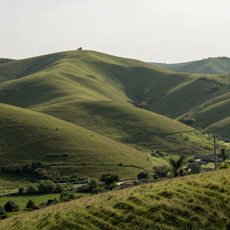 Photograph of rolling green hills under a bright, almost white sky. The hills have gentle slopes and are covered in lush grass, creating a textured, wavy appearance. In the lower right corner, there are small clusters of trees and a few scattered buildings, likely rural homes. The foreground features a grassy hill with tall, slightly browned grass. The lighting casts subtle shadows, emphasizing the hills' contours. The overall scene is tranquil and picturesque, capturing the serene beauty of a countryside landscape.