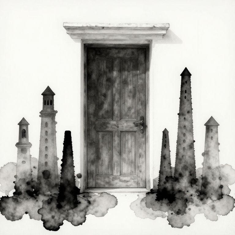 Black-and-white watercolor of a wooden door centered between four tall, dark, smoke-like towers with pointed roofs, creating a mysterious, gothic atmosphere