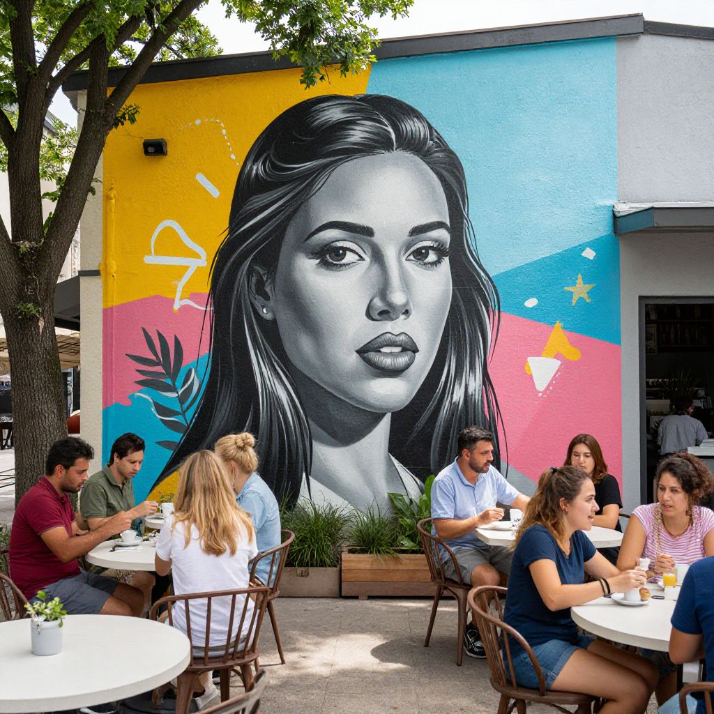 A vibrant outdoor cafe with a large mural of a woman's face on the wall, surrounded by people enjoying their time.