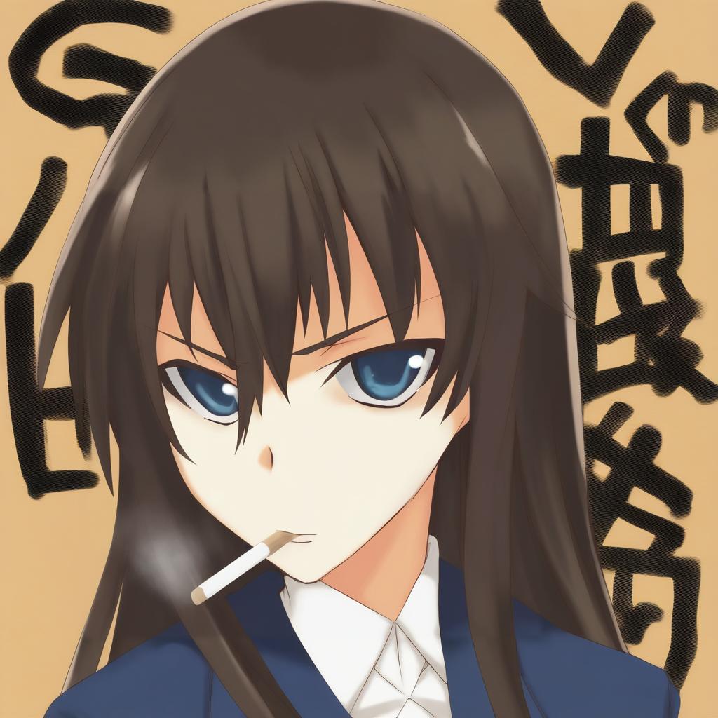 Digital illustration of an anime girl with long dark brown to black hair and blue eyes smoking a cigarette. She wears a white collared shirt under a dark blue jacket. The background features stylized black Japanese or Chinese characters on a tan backdrop. The character has a serious expression.
