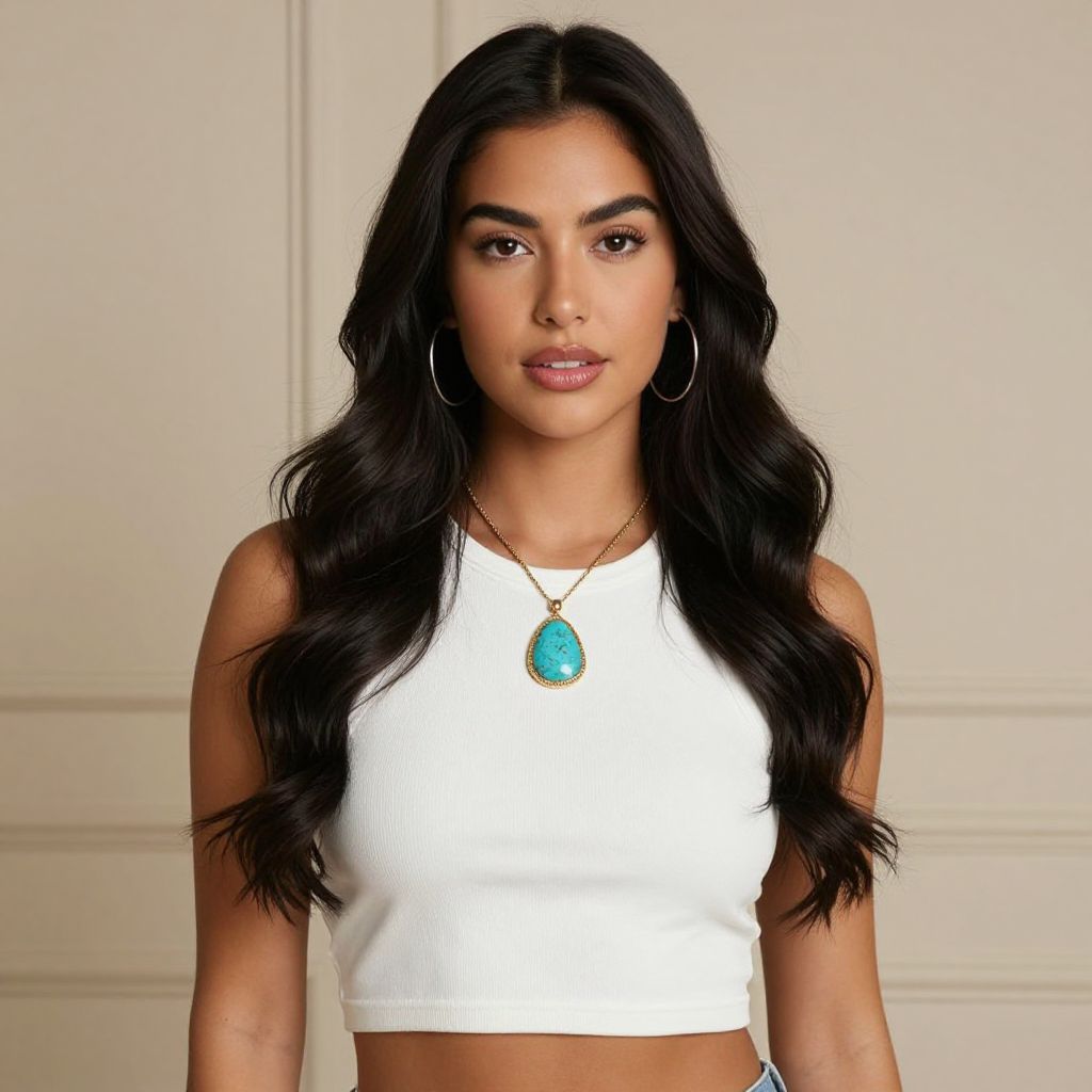 Photograph of a beautiful young woman with long, wavy black hair and tan skin, wearing a sleeveless white crop top that reveals her midriff. She has dark, well-defined eyebrows, full lips with subtle pink lipstick, and is wearing large silver hoop earrings and a gold necklace with a large turquoise teardrop pendant. The background is a plain, beige wall with subtle paneling. She looks directly at the camera with a calm, confident expression.