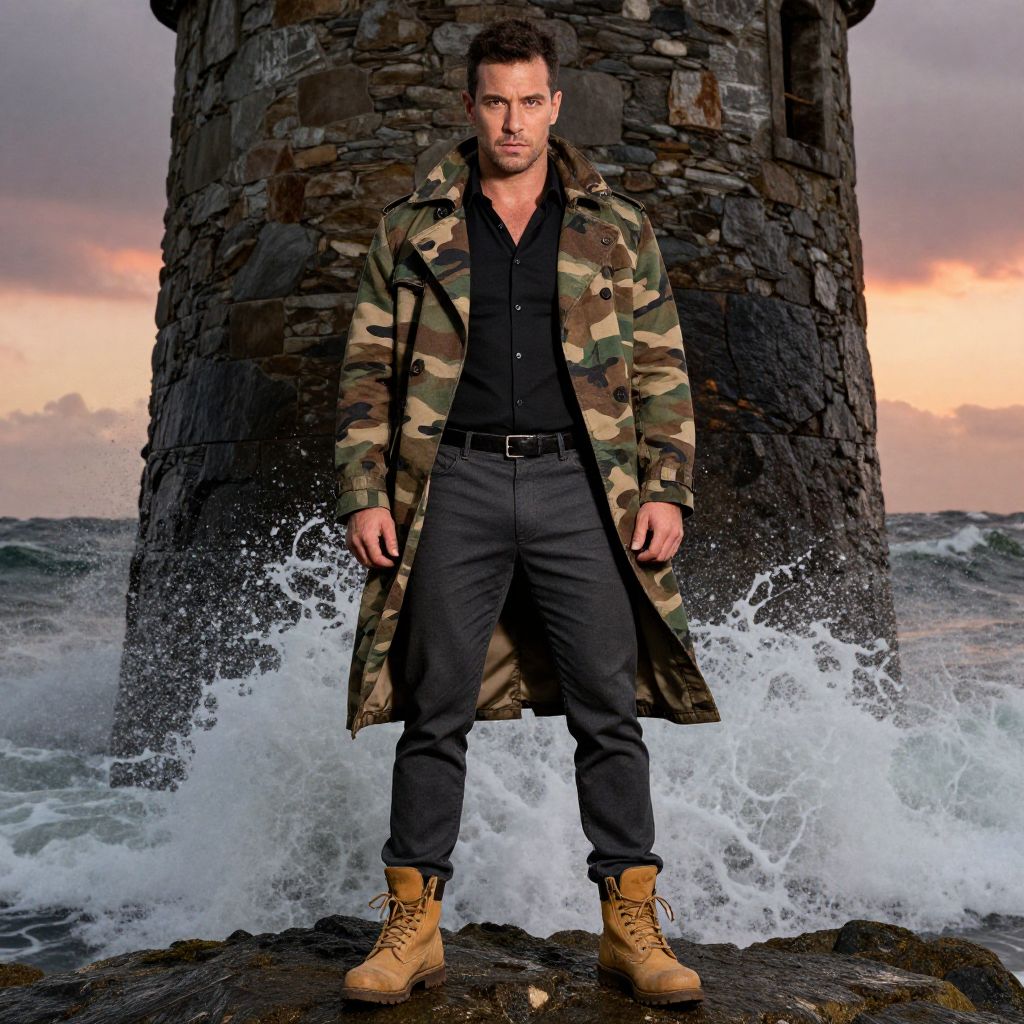 A man, camouflage-patterned trench coat, fitted black button-up shirt, dark gray slim-fit trousers, vintage-style tan combat boots, rustic stone tower, crashing waves below, dramatic sunset sky, chromogenic film, confident expression. Man has masculine face and piercing eyes