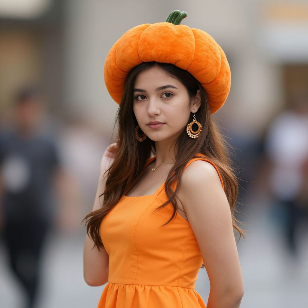"pumpkin girls costume, 1girl, solo, orange dress, dress, long hair, brown hair, looking at viewer, earrings, jewelry, hat, realistic, orange headwear, blurry background, arms behind back, blurry, closed mouth Realistic photo of casual sexy person with pretty face"