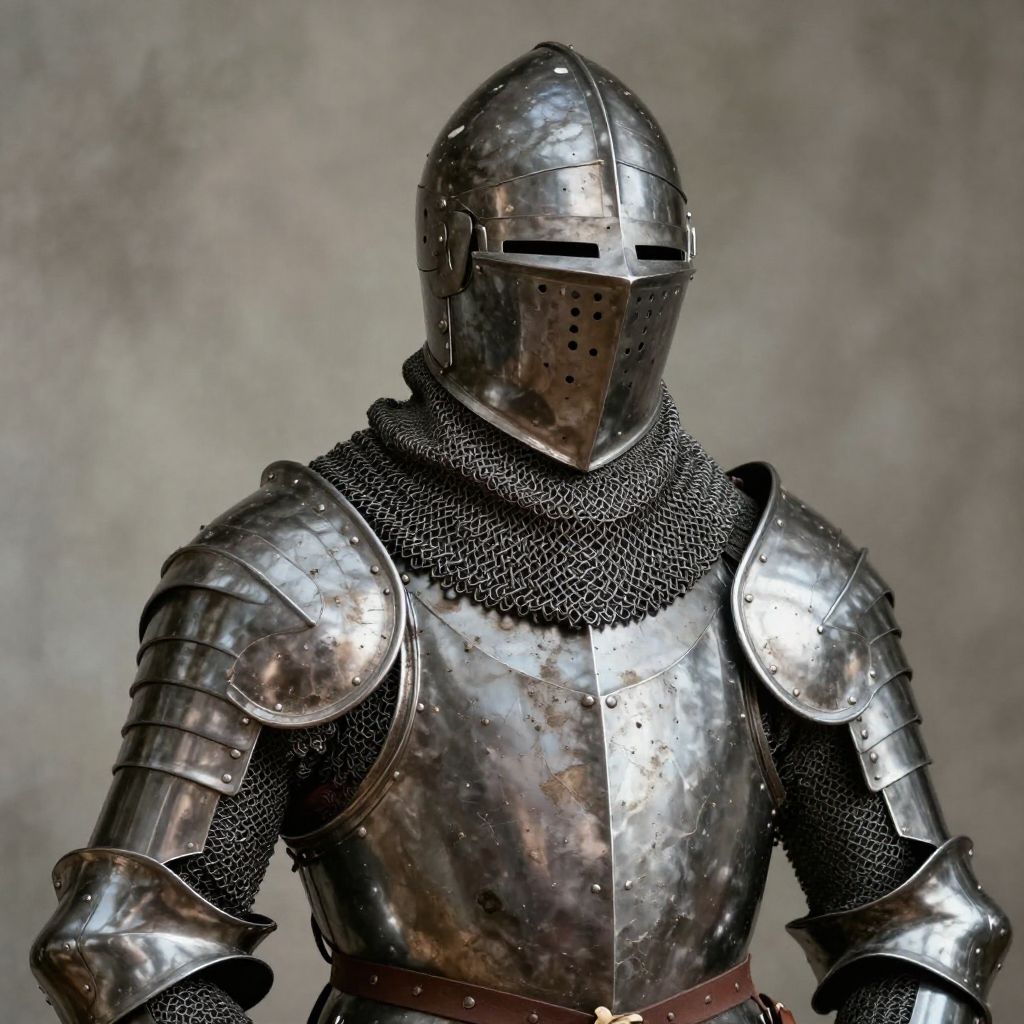 Close-up of a medieval knight wearing a full metal suit of armor, including a helmet with a visor, pauldrons, and chest plate. The armor shows signs of wear and patina, with chainmail visible under the plates and a dark cloth around the neck. The background is a textured, muted color giving a historical and dramatic atmosphere.