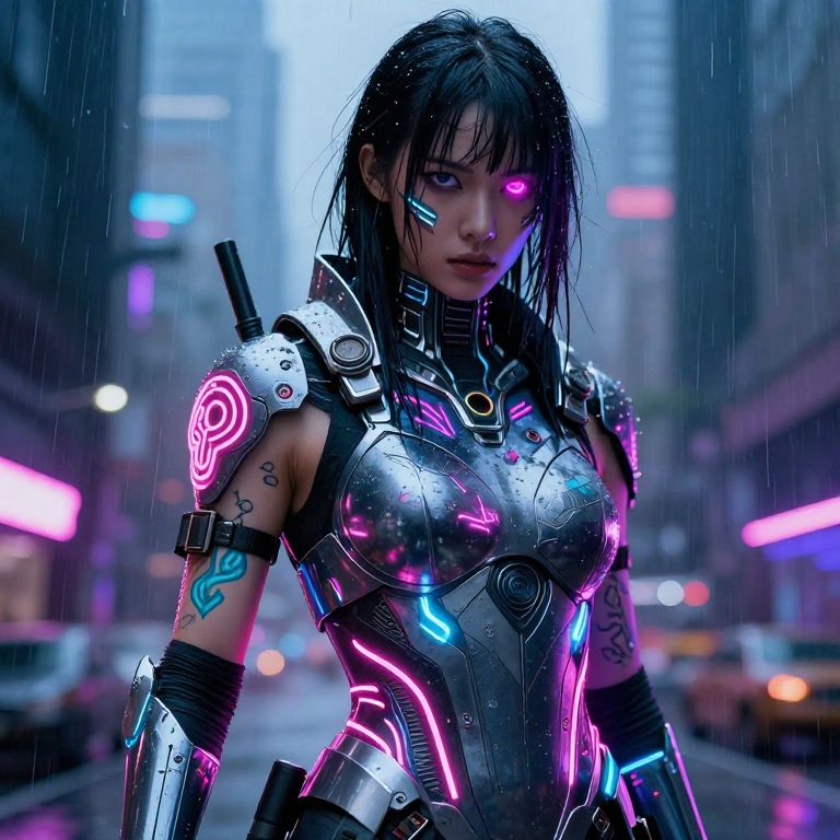 Cyberpunk woman with glowing neon tattoos, wet black hair, and metallic armor stands in a rainy, neon-lit city street at night. Digital