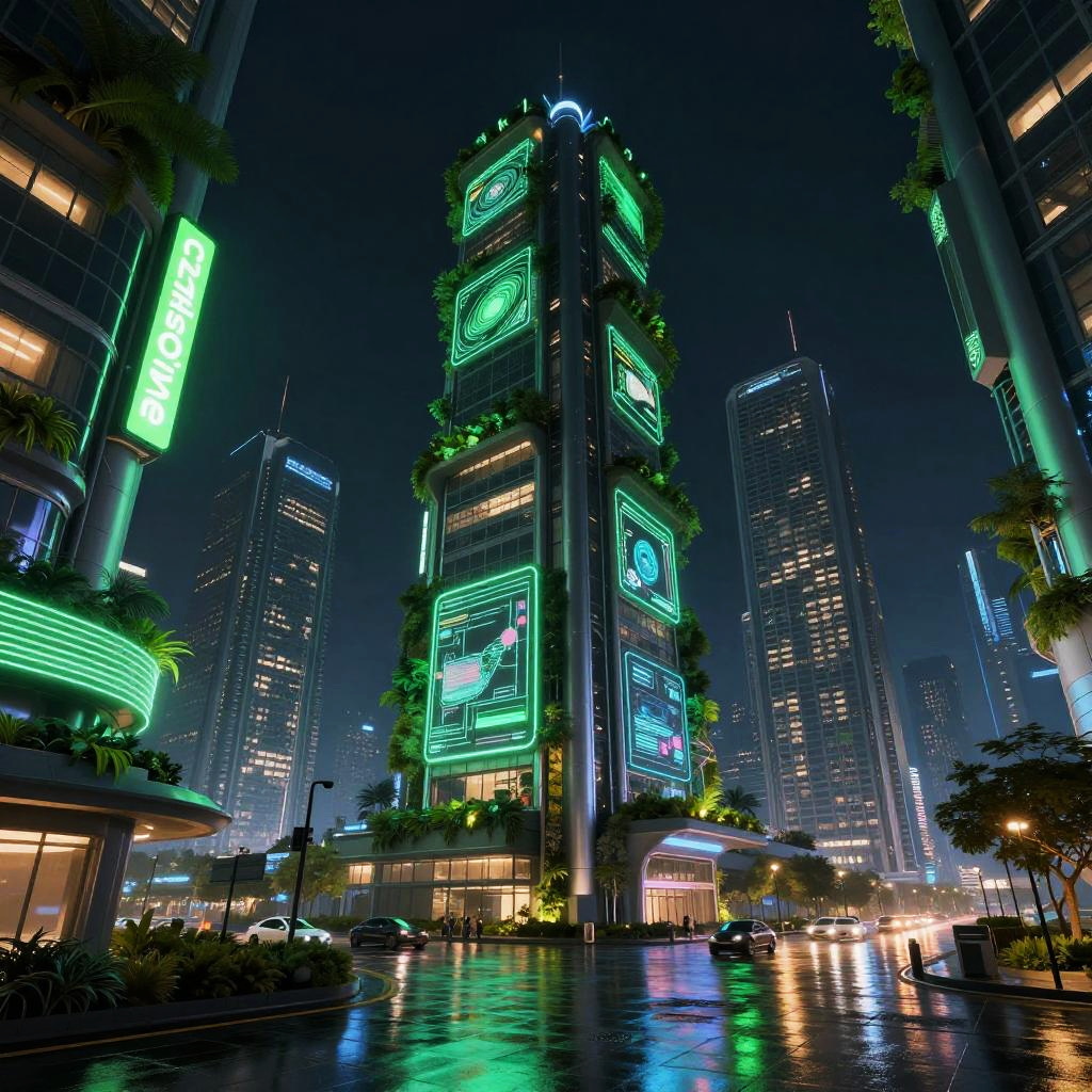 Green:czkehsoiyme= futuristic cityscape with green neon signs and holograms, sleek skyscrapers covered in vertical gardens, night scene with reflections on wet streets, cyberpunk vibe, vibrant colors