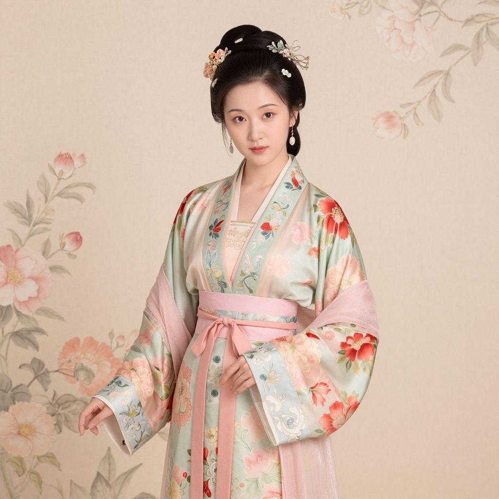 The image depicts a beautifully rendered 1800s Chinese woman, exuding grace and elegance. She is adorned in a stunning robe that features intricate pastel floral patterns, with shades of green, pink, and red. The robe is complemented by a delicate pink sash tied around her waist, adding a touch of sophistication. Her hair is elegantly styled in an updo, adorned with floral accessories that match the robe's design. The background is a soft, pastel-toned canvas, decorated with subtle floral elements that enhance the overall harmony of the scene. The composition is balanced, with the woman centrally positioned, and the floral patterns creating a sense of depth and movement. The interplay of colors and textures, along with the detailed rendering of the robe and accessories, contributes to the image's rich visual appeal.
