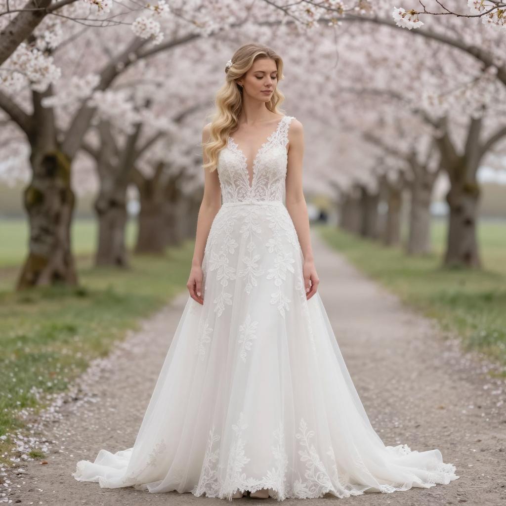 Non binary wedding outfit, photograph of a beautiful woman in a pale pink, lace-trimmed, V-neck ball gown with sheer sleeves, standing in an ornate, elegant indoor garden setting, floral archway with pink and white flowers in the background, natural light, serene expression, long brown hair in an updo, soft ures, classical architecture, detailed embroidery on the dress, rich colors, romantic atmosphere, formal event attire, elegant setting