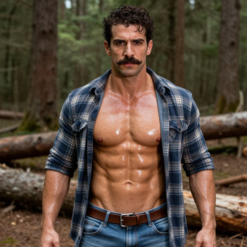 Photograph of a muscular, bearded, shirtless man with dark curly hair and chest hair, standing outdoors against a blurred mountain background.
