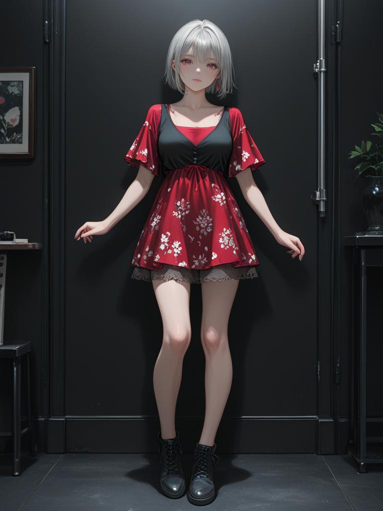 1girl, realistic face, full body shot, Woman, casual chic, fitted short-sleeve bodysuit with a floral pattern in red, black, and gray tones, scoop neckline, brief-cut leg opening, paired with no visible accessories, studio background with a gradient from dark to light gray.