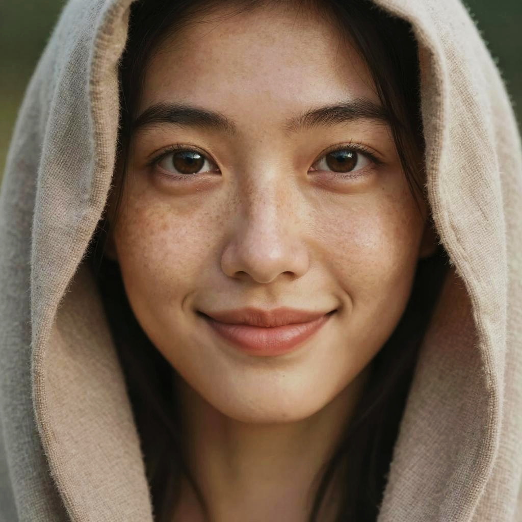 Photograph of a young Asian woman with fair skin, freckles, and large, dark brown eyes. She is wearing a beige, hooded sweater that frames her face. Her lips are slightly curved into a gentle smile, and her dark brown hair peeks out from under the hood. The background is blurred greenery, making her face the focal point. The texture of the sweater is soft and slightly fuzzy, contrasting with the smoothness of her skin. The lighting is natural, highlighting her youthful features and subtle makeup-free look.