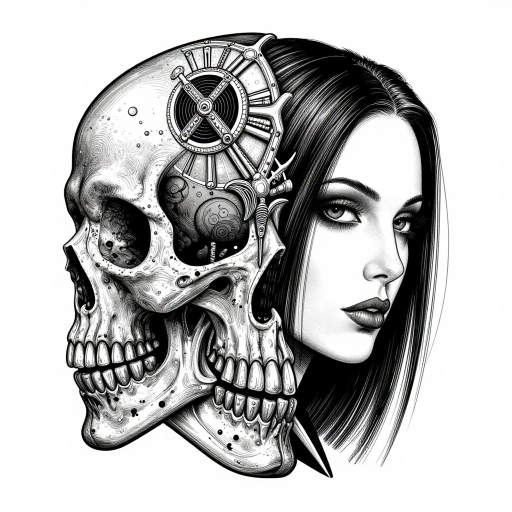 Black-and-white digital illustration of a woman with long dark hair, partially obscured by a detailed, gears-adorned skull on her left side.