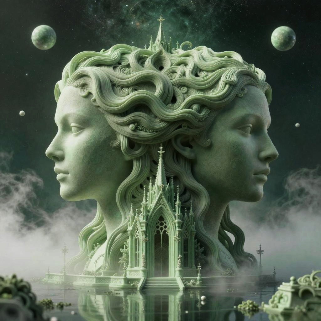 This is a digitally created, surrealistic artwork depicting a green-tinted marble statue of two women's heads facing opposite directions, with intricate, flowing hair. The statues are positioned back-to-back, with a detailed, glowing Gothic-style castle emerging from where their heads meet. The background is a dark, starry sky with floating planets, and ethereal clouds surround the castle. The overall color palette is dominated by green and white, with a mystical, otherworldly atmosphere. The texture of the marble is smooth, and the castle's architecture is highly detailed, enhancing the surreal and fantasy-like quality of the image.