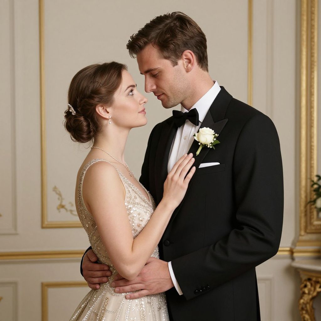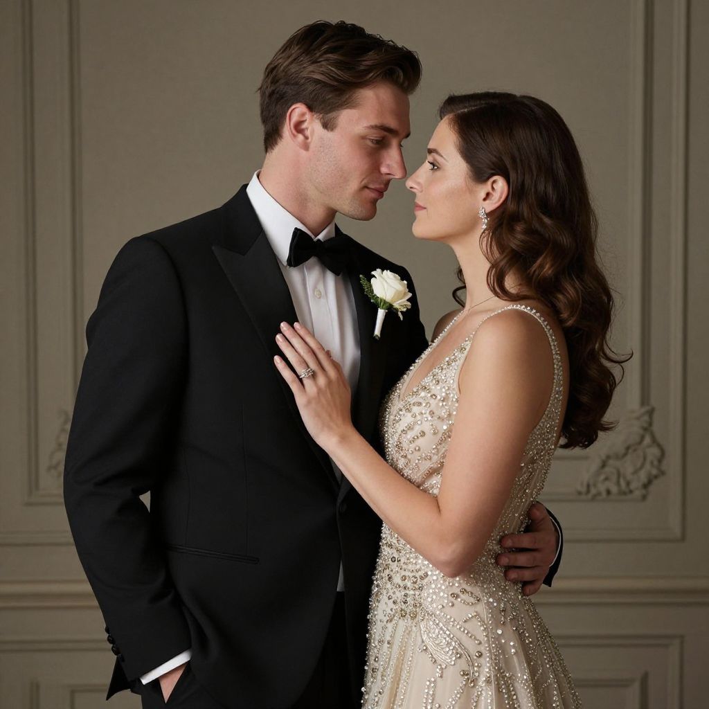 Elegantly dressed couple in formal attire share an intimate moment, with the man in a tuxedo adorned with a white boutonniere and the woman in a sparkling gown, both gazing tenderly at each other against a classic backdrop.