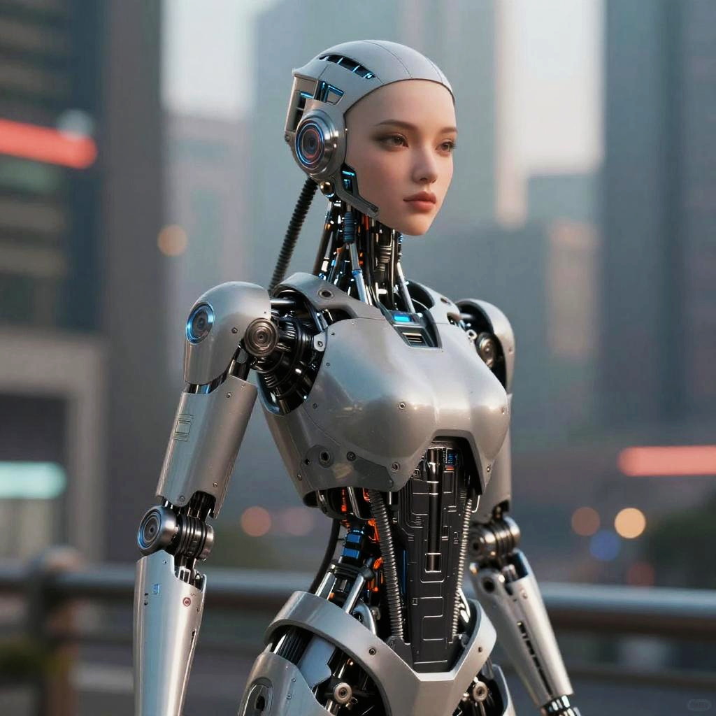 A highly detailed, photo-realistic image of a mechanical girl with a human-like face and advanced robotic body. The figure features mechanical limbs, intricate joints, and a sleek white exterior. The background displays a high-tech laboratory environment with computer monitors and scientific equipment.