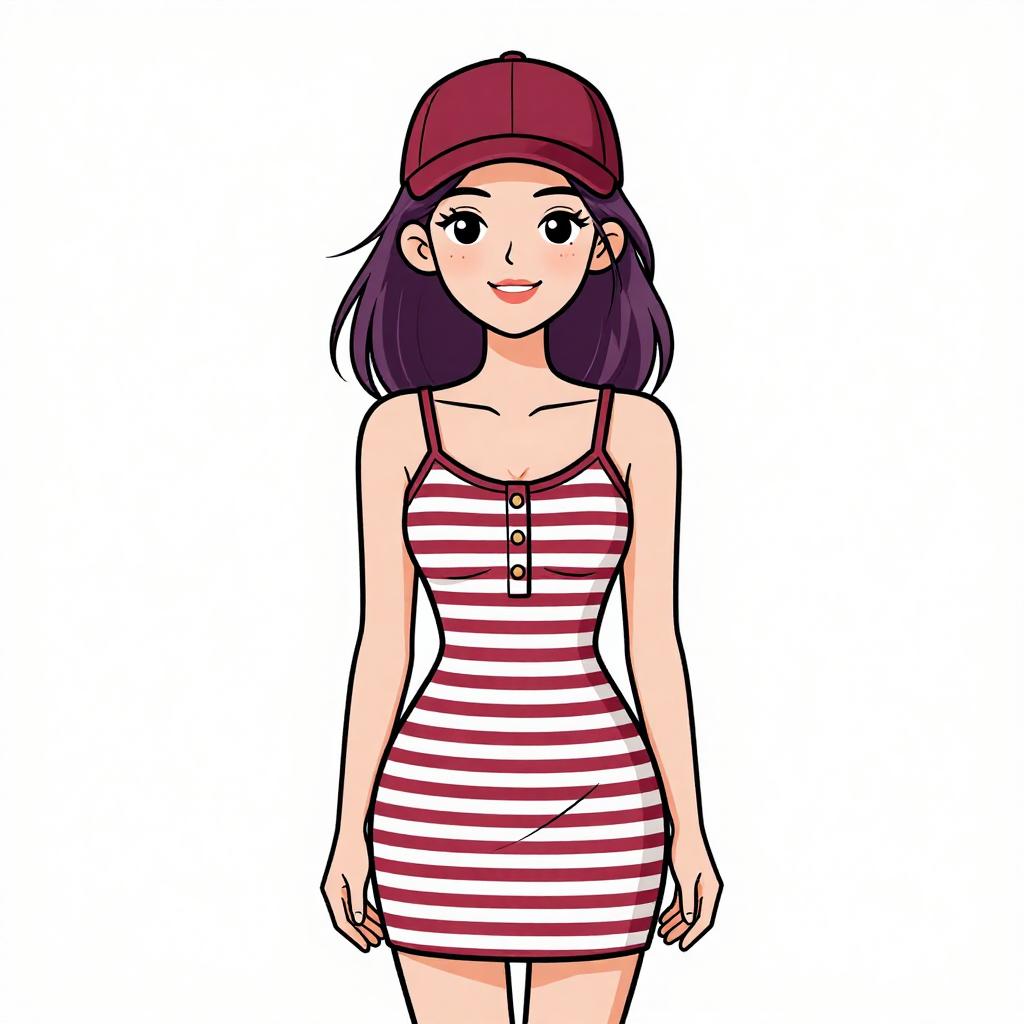 Cartoon-style digital drawing of a smiling young woman with dark purple hair, wearing a red baseball cap, red and white striped tank dress, and standing