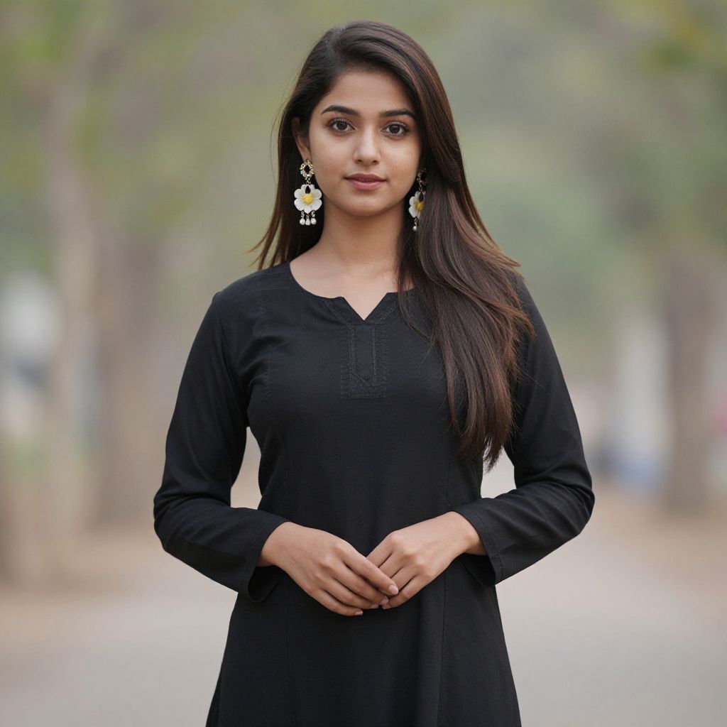 "black velvet lehenga choli, 1girl, solo, jewelry, long hair, blurry background, brown hair, flower, blurry, necklace, looking at viewer, earrings, shirt, skirt, outdoors, black shirt, realistic, field, flower field, long sleeves, k-pop, smile, mole Realistic photo of casual sexy person with pretty face"