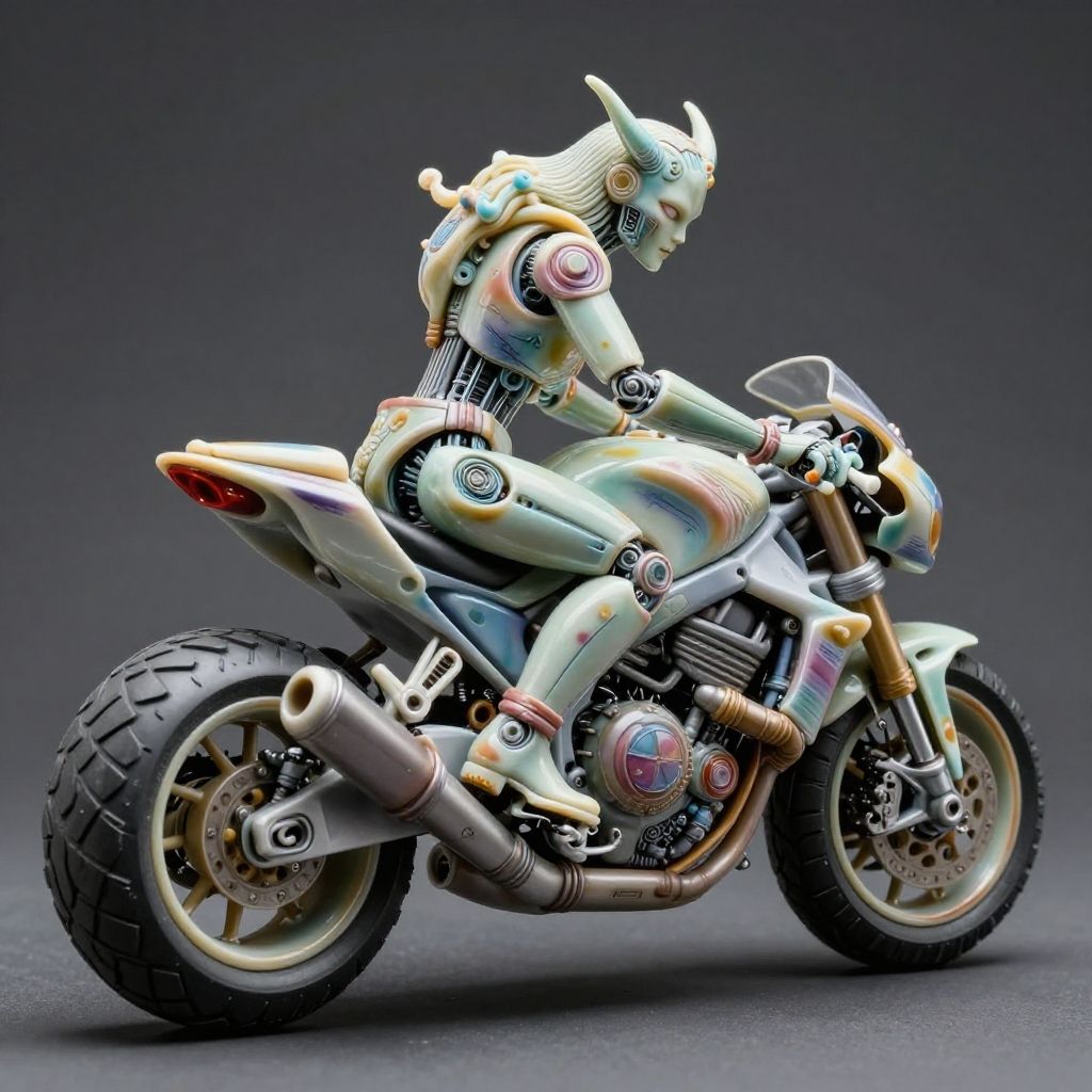 Cinematic photo-realistic, a Carved porcelain cyborg demons with aspects of a motorcycle such as handlebars on his shoulders, exhaust pipes on his forearms and legs, two tire wheels instead of feet, and a paint job color scheme, in cyberpunk 2077 style, 16K resolution, macro resolution