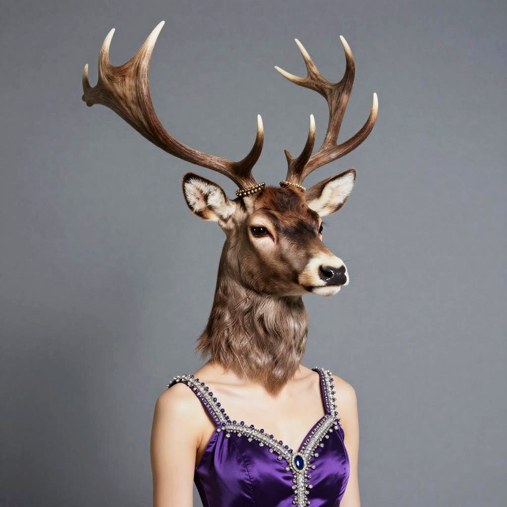 Stag Head Fancy Dress, woman in a purple dress with a deer headdress