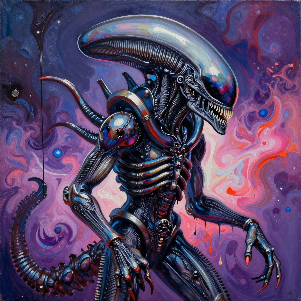 Xenomorph colors acrylic painting style, blending dark metallic tones with bright, surreal colors, dripping paint effect enhancing the alien monstrous form in an abstract cosmic environment