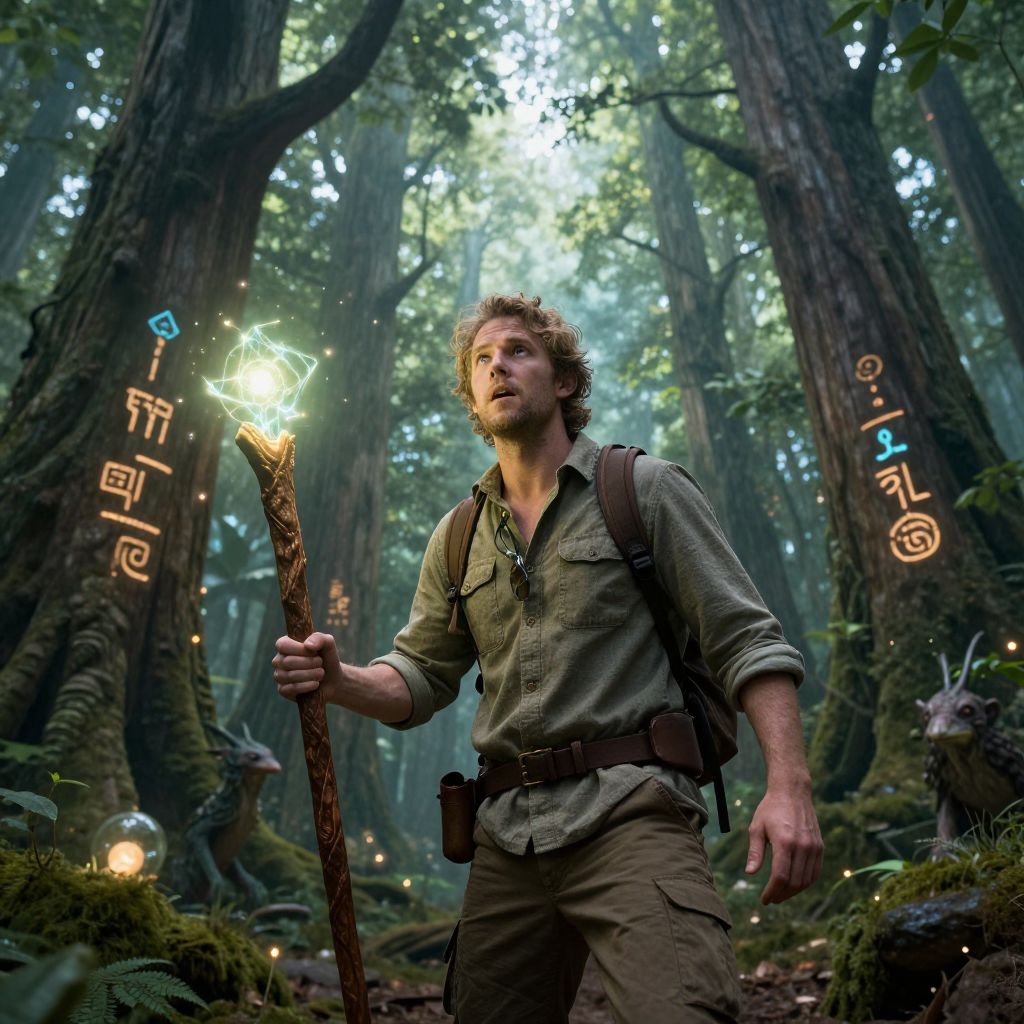 Therman in a dense enchanted forest, ancient towering trees with glowing runes, magical light filtering through leaves, mystical creatures lurking, wearing rugged explorer gear, holding a glowing staff, expression of wonder and determination.