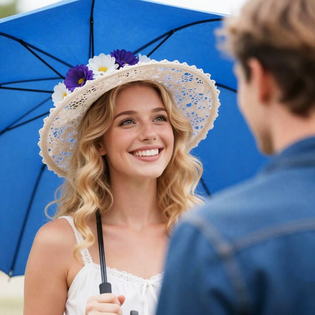 Photograph of a young woman with curly blonde hair, wearing a white hat and a white shirt with a yellow vest. She is smiling, looking to the side, and resting her hand on her cheek. She is seated inside a moving bus with a green grassy field visible through the window in the background.