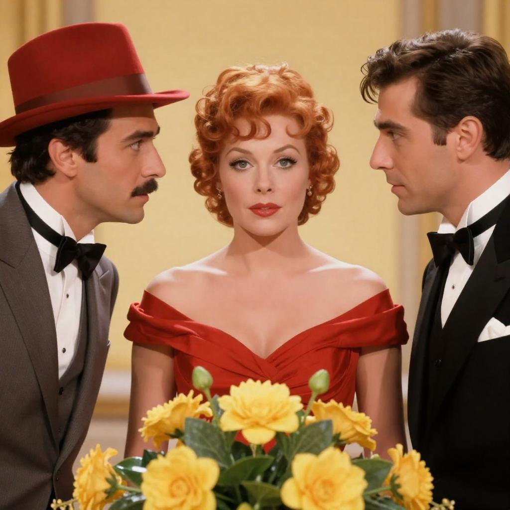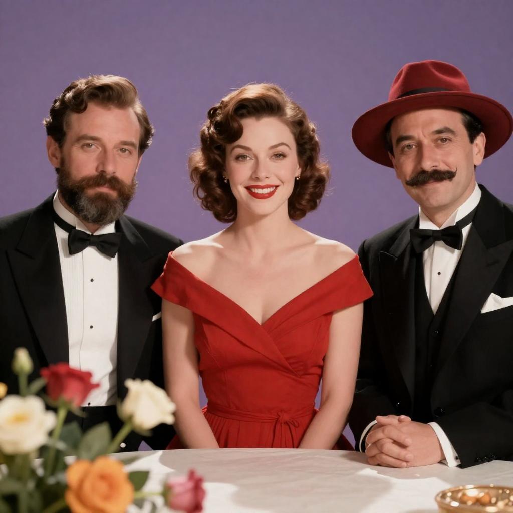 Vintage movie poster. Three people: a smiling man in a military uniform on the left, a mustached man in a tan suit with exaggerated expressions in the center, and a woman in a red dress on the right. The man in the suit is clapping, and the woman is smiling and clapping his hand. The background shows a blurred, elegant interior. Bright, warm colors. The man in the center stands slightly forward.