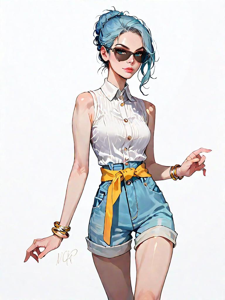 1girl, source_comics, realistic face, full body shot, Woman, contemporary casual, sleeveless romper in powder blue, V-neckline, pleat detailing, cinched waist with tie belt, short relaxed-fit shorts, white espadrille wedge sandals, delicate silver bangle, plain white background.