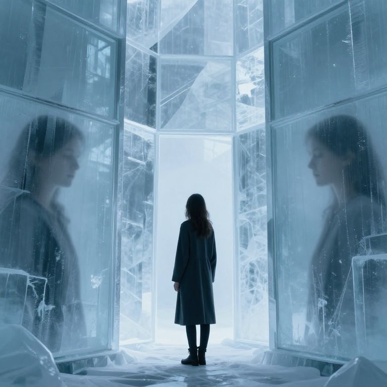 Photograph of a dark-haired woman standing in the center of a futuristic, icy room with large, translucent, cracked walls. She faces a bright, white-lit doorway, her silhouette sharply contrasted against the light. The walls reflect her image, creating a mirrored effect. She wears a long, dark coat, and the icy texture of the room adds a cold, almost ethereal ambiance. The dominant colors are blue and white, enhancing the futuristic, sci-fi aesthetic. The image has a high-contrast, dramatic lighting style, emphasizing the woman's solitary presence and the stark, otherworldly environment.