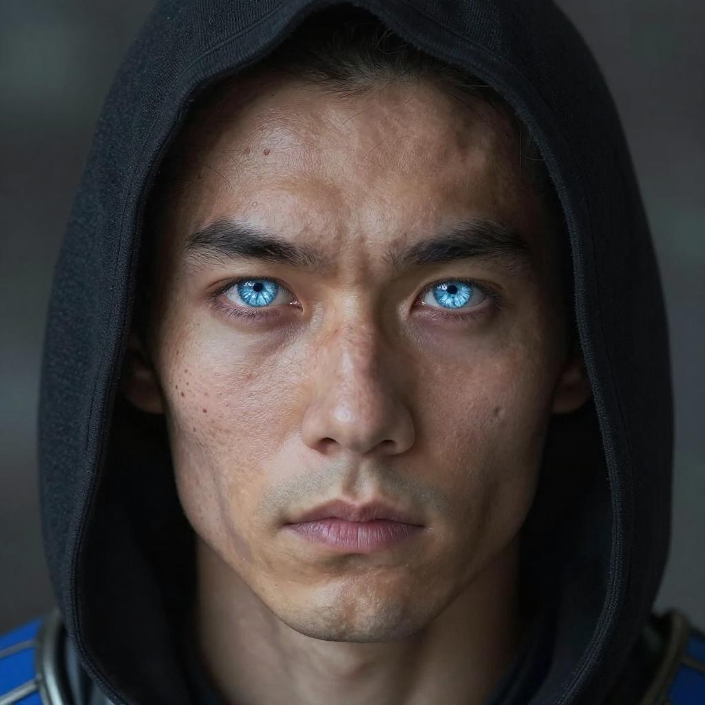 Photo shot on Nikon D850, 16k, HDR, sharp focus, insanely detailed, intricate, perfectionism, max detail, masterpiece, breathtaking, atmospheric perspective, (diffusion, pore correlation, healthy moisturized textured skin, skin imperfections), DSLR, 80mm Sigma f2, depth of field, film grain, intricate natural lighting, ((subzero from mortal kombat)), detailed ice blue eyes, (black and blue armor), black hood, veins on his arm, Intricate, High Detail, Sharp focus, dramatic, photorealistic painting art by greg rutkowski